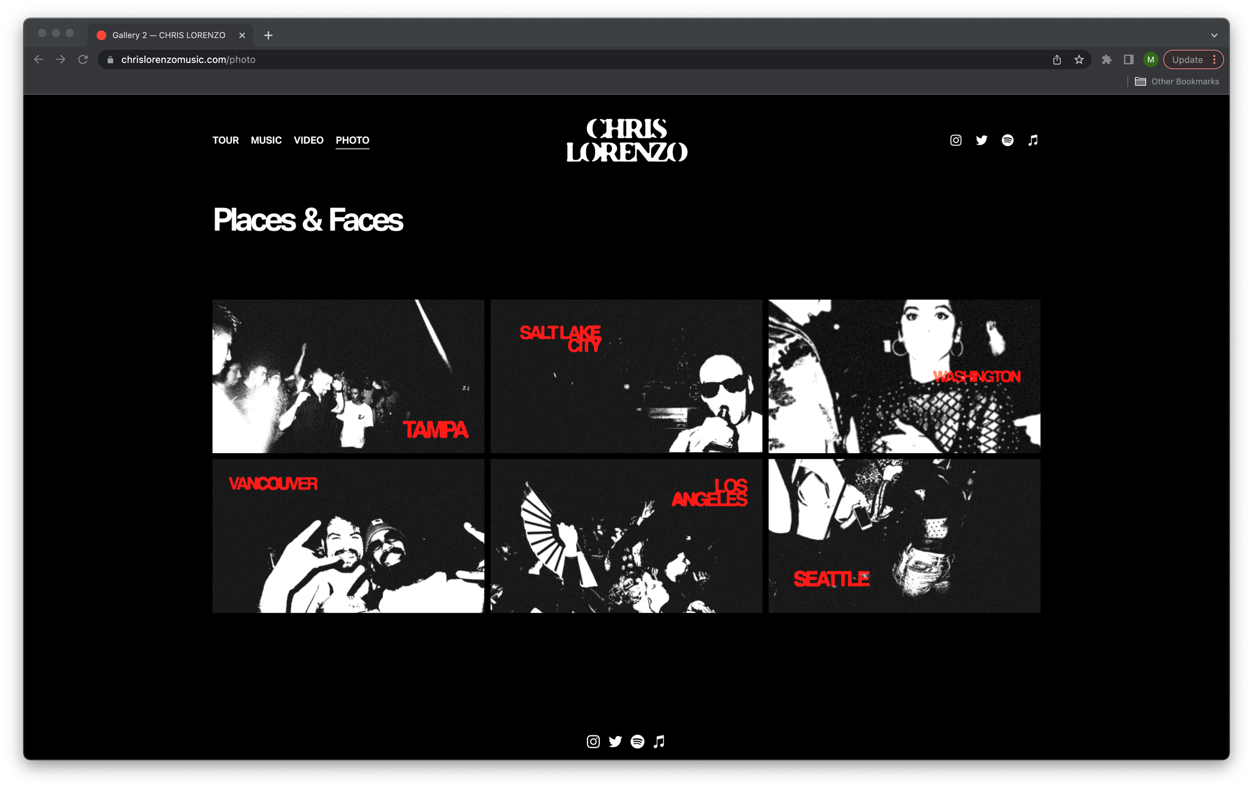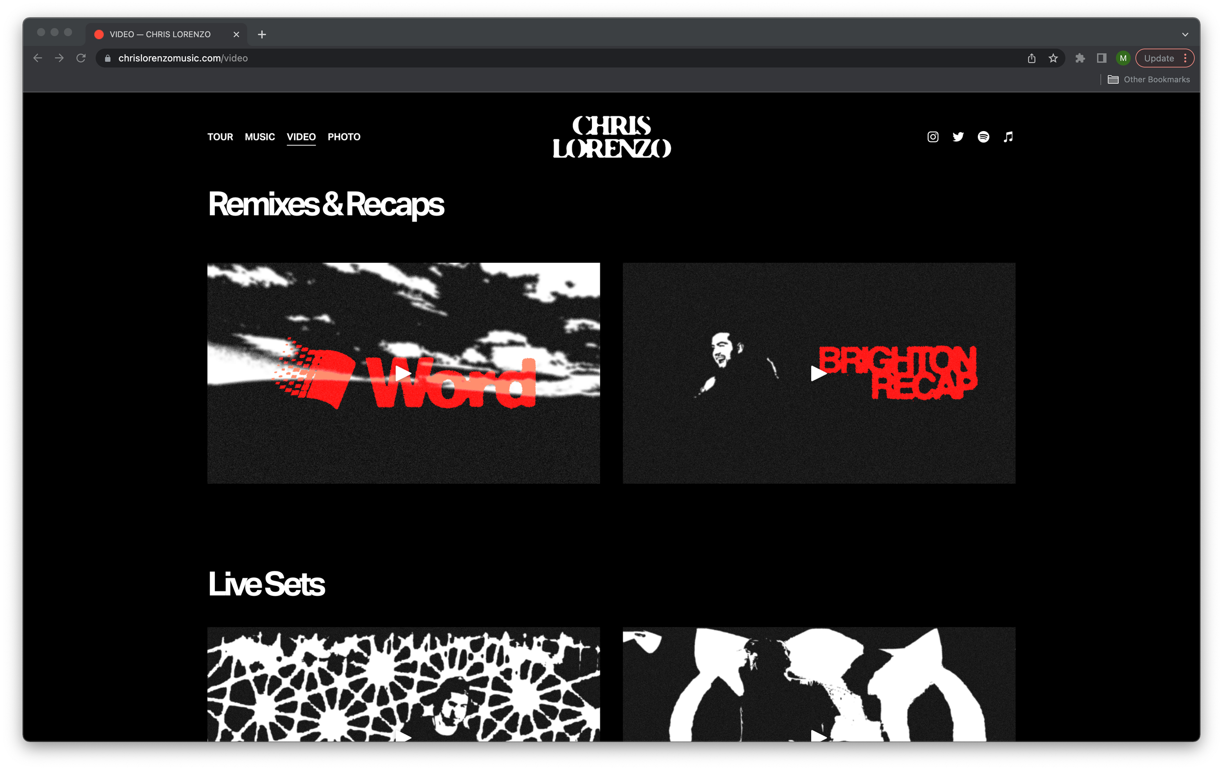 I designed Chris Lorenzo’s official logo though a series of steps that began with the font MADE Mirage. Using Photoshop, I typed out the name and adjusted the tracking of each character independently. I rasterized the layer, added a field blur with multiple points, gaussian blur, then set the threshold.